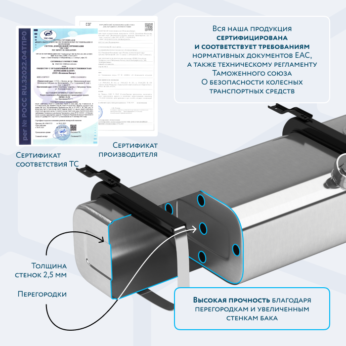 Топливный бак имеет паспорт и декларацию таможенного союза, который будет вложен к топливному баку. Бак упакован в надежную, деревянную обрешетку для транспортировки. Предоставляем честную гарантию 3 года.