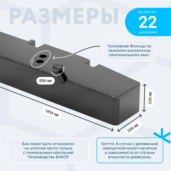 Топливный бак (аналог увеличенной ёмкости) производства БАКОР предназначен для установки на а/м УАЗ Хантер с бензиновым двигателем на левую сторону. Бак может быть установлен только с применением креплений нашего производства.
